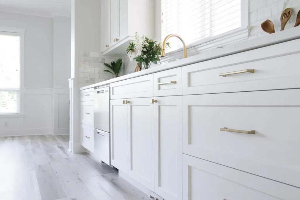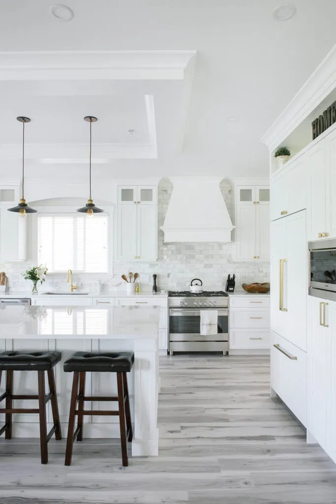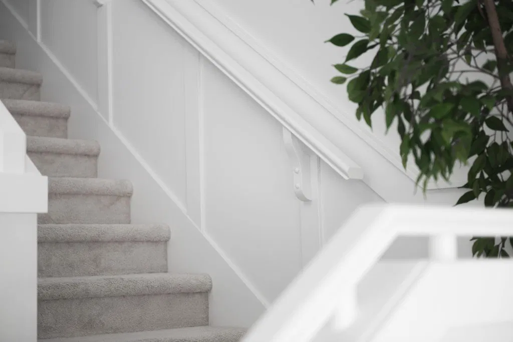 The project was completed in two phases. First, we laid down Synergy vinyl plank flooring in Sanibel, which is extremely durable, low-maintenance, waterproof and quiet—the ideal flooring for families, pets and high-traffic homes. (We’ll be returning to add vinyl plank to other rooms). Carpeting, wainscotting, detailed handrails and fresh paint improved the staircase.