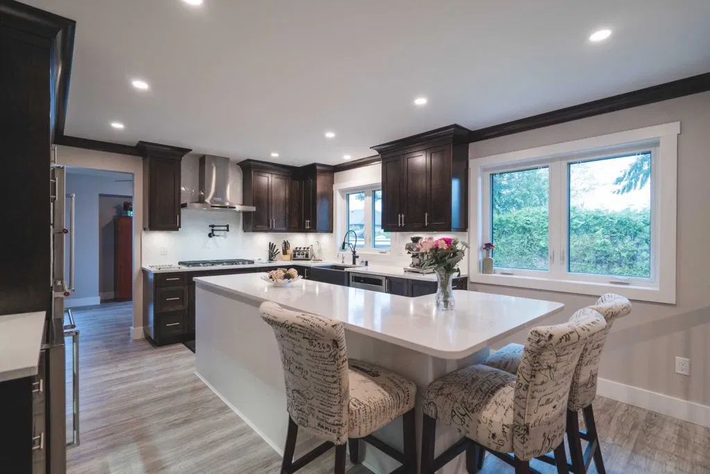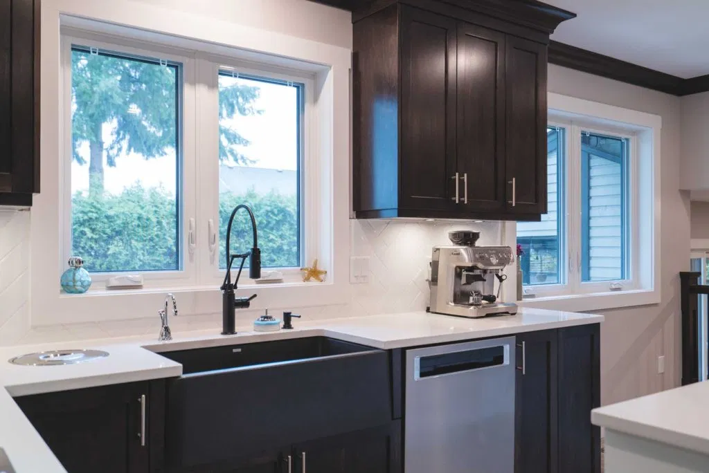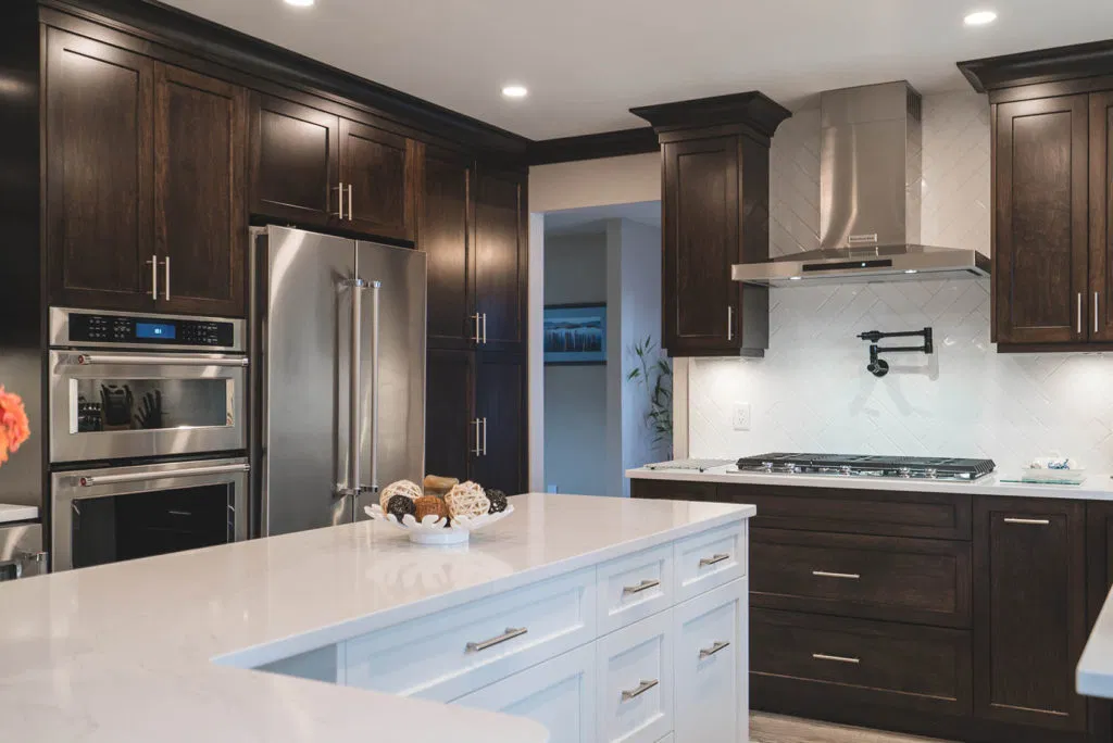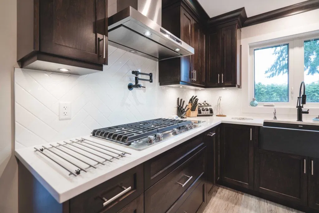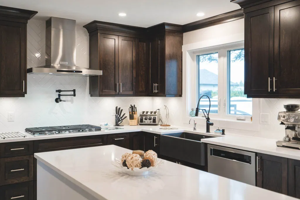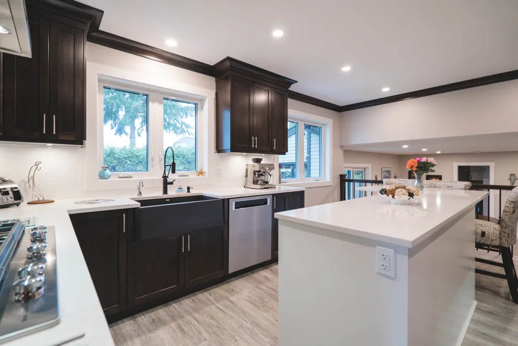 These homeowners wanted to update their 1982 home with a full kitchen reno to suit their lifestyle. NOVERO fully demoed the old cabinetry, flooring, plumbing, electrical, tile backsplash, drywall, countertops and prepped a whole new kitchen area. This couple definitely knew all the details required to make their kitchen incredibly functional for their needs. The custom installation includes a built-in compost system; dog food & water station; an area for pans and cutting boards; a pot filler faucet above the stove; spice racks; bread drawer; garbage/recycling pull outs; and under-the-sink roll outs. Beautiful Silestone Eternal Calacatta Gold countertops in a polished finish make a dramatic statement on the all-white island, and in contrast the dark maple custom cabinetry around the perimeter of the kitchen. Our favourite feature is the Blanko Ikon 33 Farmhouse sink and the matte black faucets. The client loves how the L-shaped island is the visual focus, but is also entirely functional for entertaining and cooking. The white glossy herringbone backsplash is another striking contrast with the dark shaker style cabinetry. Lastly, we completed a wet bar and den adjacent to the kitchen, to expand their space for entertaining.
