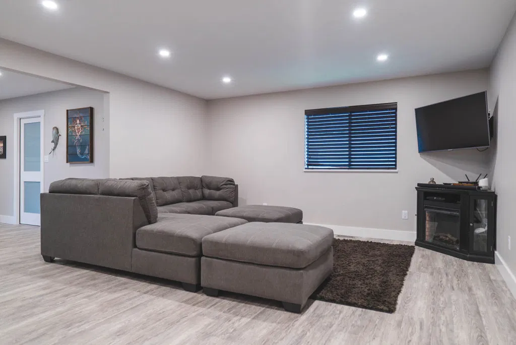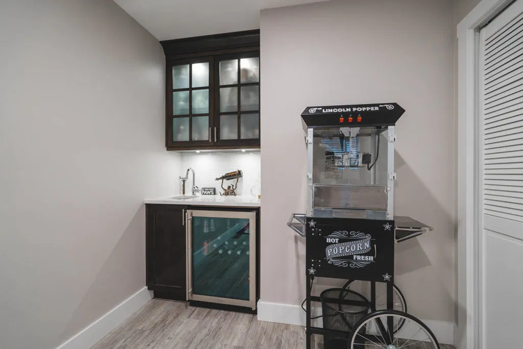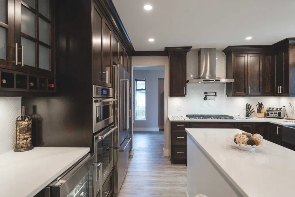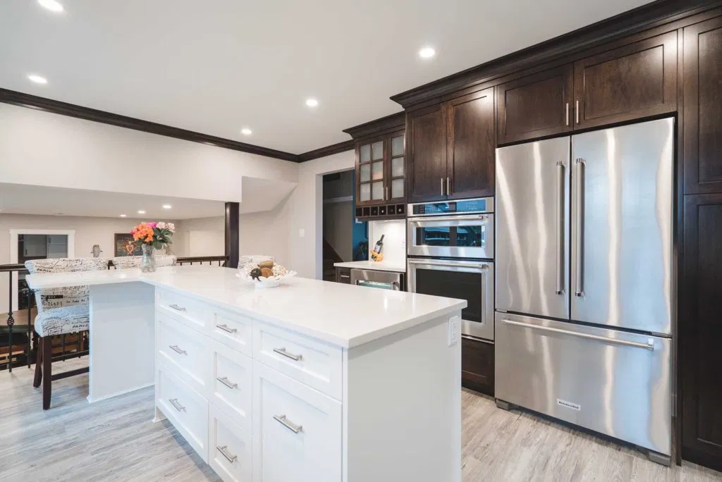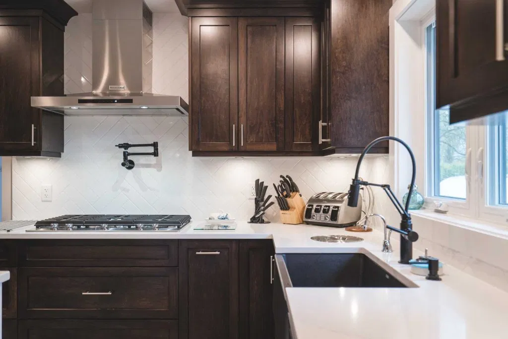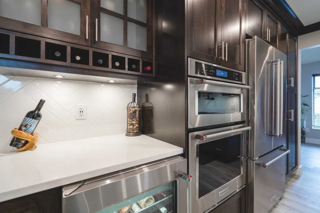 These homeowners wanted to update their 1982 home with a full kitchen reno to suit their lifestyle. NOVERO fully demoed the old cabinetry, flooring, plumbing, electrical, tile backsplash, drywall, countertops and prepped a whole new kitchen area. This couple definitely knew all the details required to make their kitchen incredibly functional for their needs. The custom installation includes a built-in compost system; dog food & water station; an area for pans and cutting boards; a pot filler faucet above the stove; spice racks; bread drawer; garbage/recycling pull outs; and under-the-sink roll outs. Beautiful Silestone Eternal Calacatta Gold countertops in a polished finish make a dramatic statement on the all-white island, and in contrast the dark maple custom cabinetry around the perimeter of the kitchen. Our favourite feature is the Blanko Ikon 33 Farmhouse sink and the matte black faucets. The client loves how the L-shaped island is the visual focus, but is also entirely functional for entertaining and cooking. The white glossy herringbone backsplash is another striking contrast with the dark shaker style cabinetry. Lastly, we completed a wet bar and den adjacent to the kitchen, to expand their space for entertaining.
