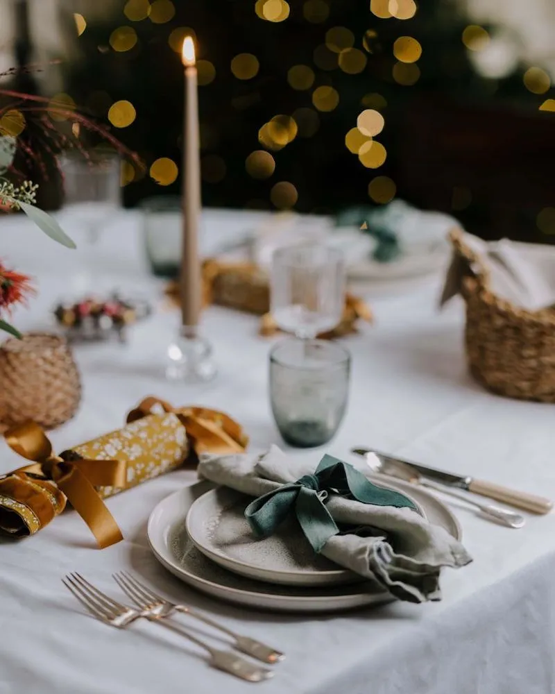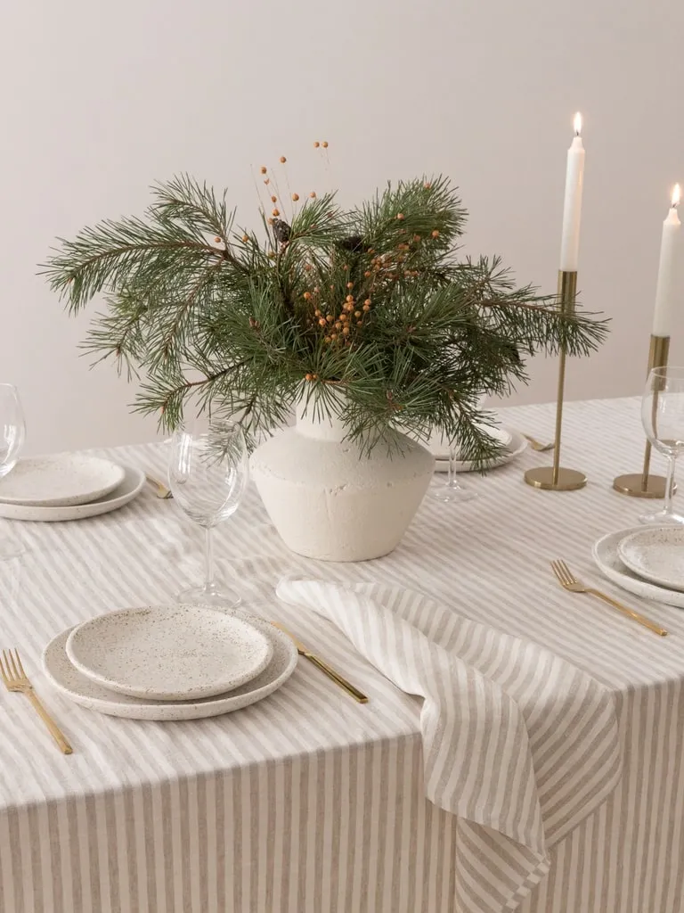 Designer Jenni Kayne is known for her laid-back luxury aesthetic. This tablescape reflects her effortlessly elegant style— focussing on natural textures and a neutral palette reflective of her Californian landscape. Her more relaxed approach includes forgoing traditional table linen. Instead she tied loosely-bundled napkins with jute rope, greenery, and a tiny pine cone. She gives the table decor an elevated touch by using stemmed glassware and silver candlestick holders.
