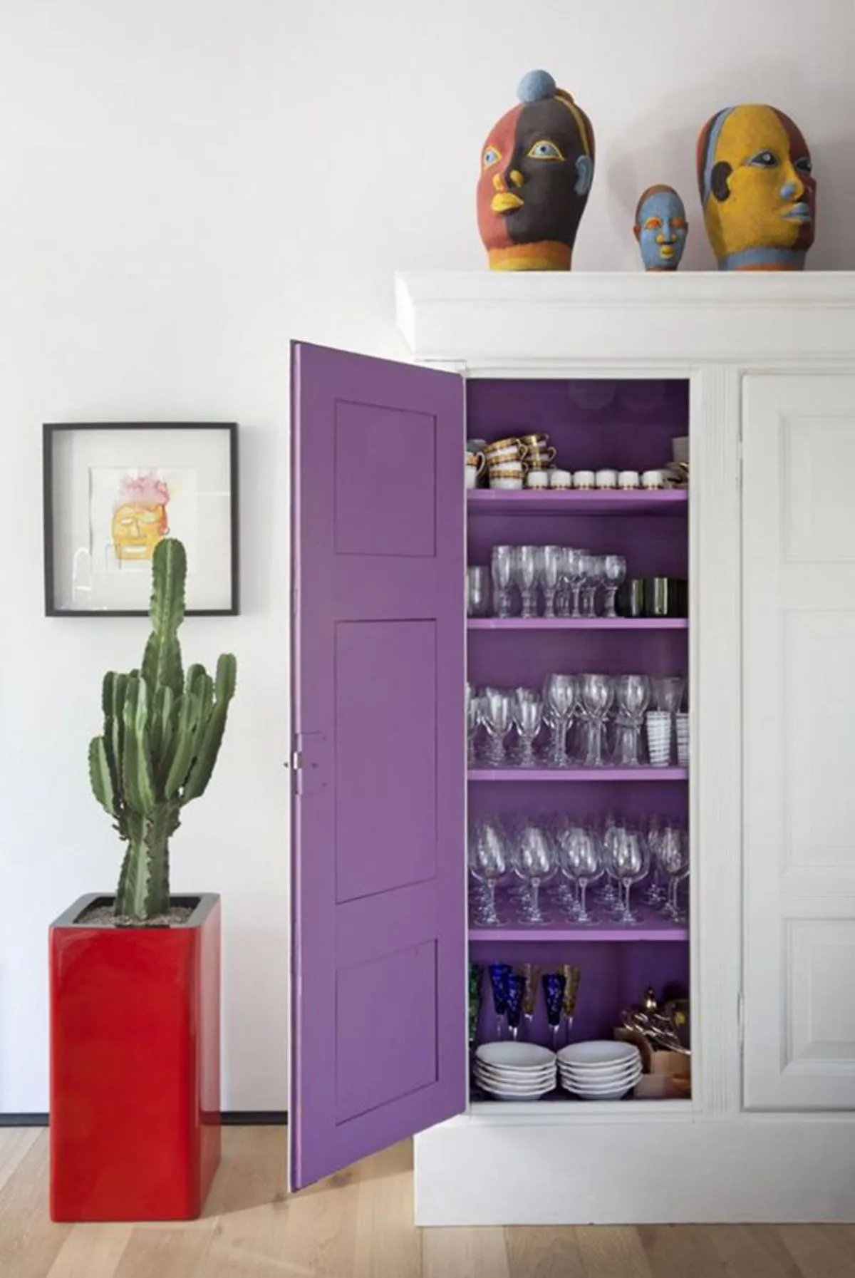 When in doubt, paint it. Because once you’re over it, you can just paint over it again. We always advise our clients to factor bringing color in through paint, especially if it’s a trend color or they’re worried they won’t love it for years to come. We think that Ultraviolet is a beautiful statement color for a front door. It’s bold hue will pop and pairs beautifully with antique brass. Of course, you can always paint a feature wall or inside a cabinet too.
