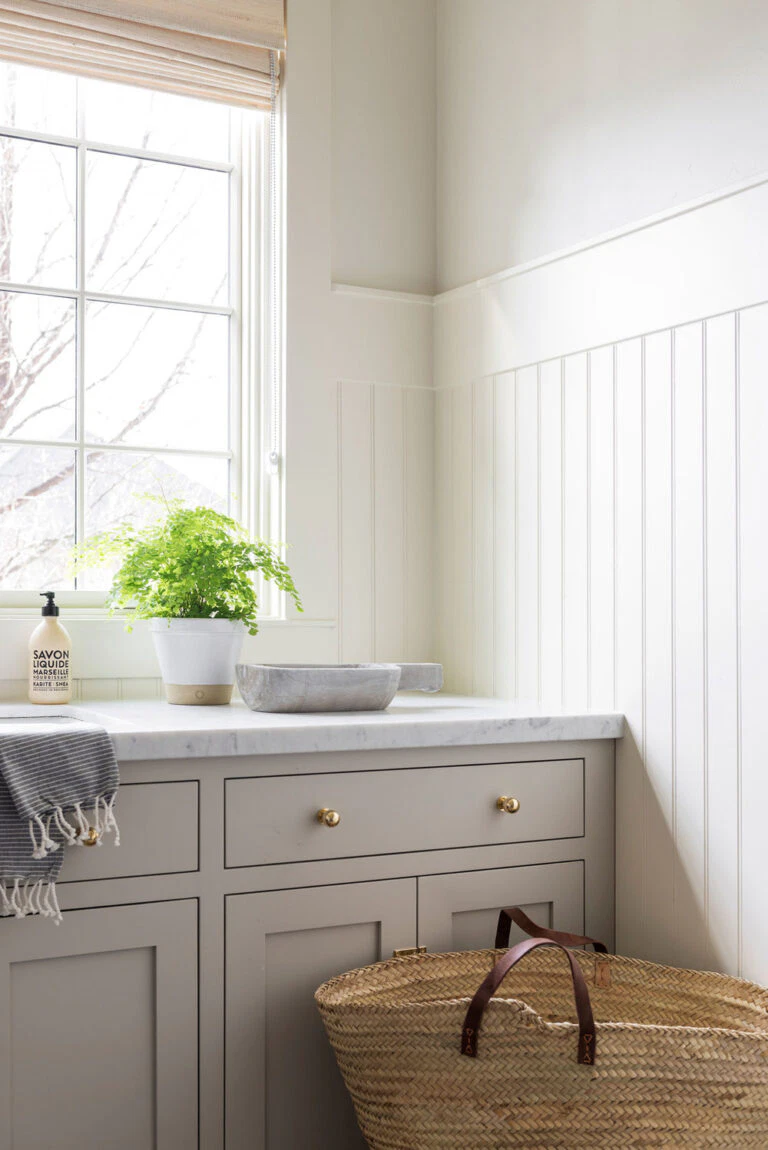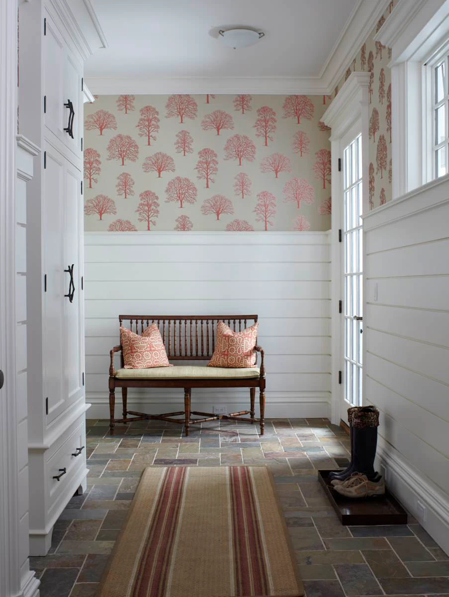 Even shiplap is given the wainscoting treatment: like beadboard, makes a space feel more homey. It’s also the perfect solution for protecting walls in higher-traffic areas like mudrooms—with the added protection of the right sheen of paint, of course.